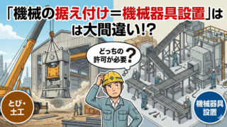 「『機械の許可を取れ』と言われたんやけど…機械器具設置工事業?」、機械を扱う工事なら何でもこれに当てはまると勘違いされがちです。多くは「とび・土工工事業」に分類されます。この2つの業種の違いと、大阪での正しい区分の仕方を解説します。